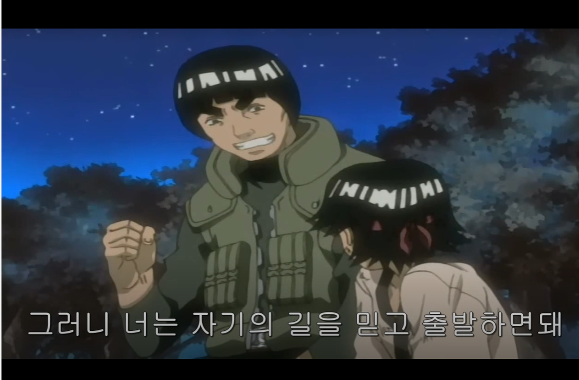 > "하지만 지금은 라이벌인 카카시와의 대결에서도 이기고 있지. 그러니까 너도 자신을 믿고 노력하면 돼."
