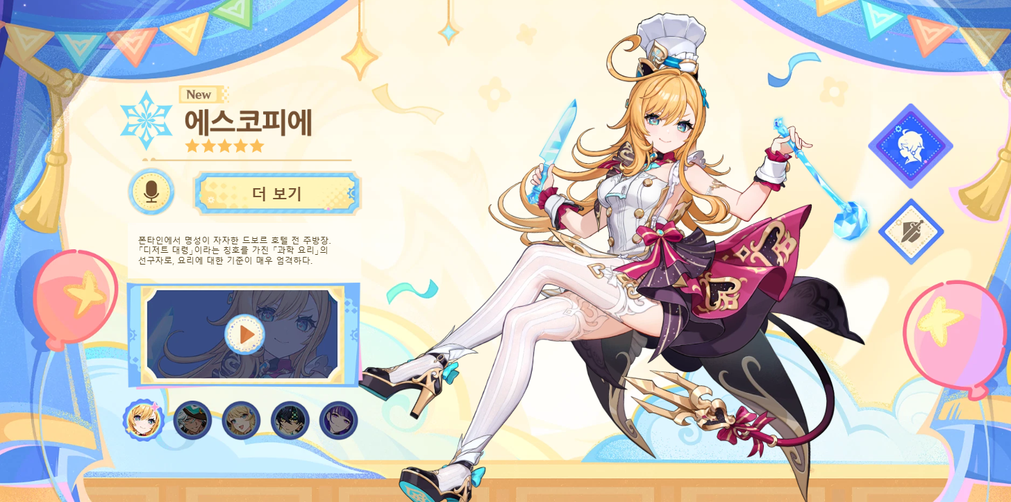 드보르 호텔의 이전 총주방장 '에스코피에'가 5성 얼음 원소 장병기 사용자로 등장합니다. 그녀는 요리 기술을 전투에 활용하며, 치유 능력과 함께 적의 물/얼음 원소 저항을 낮추는 특화된 기술을 보유했습니다. 특히 팀 내 물/얼음 원소 캐릭터가 많을수록 그녀의 저항 감소 효과가 강화됩니다.