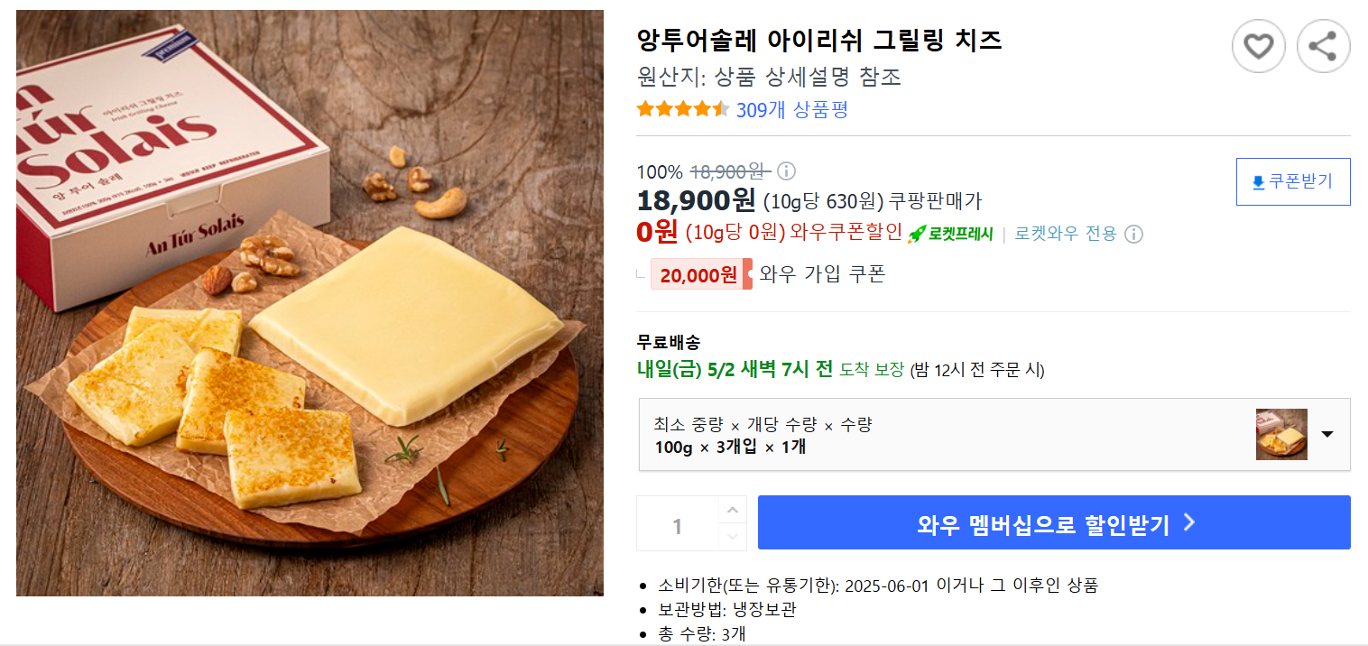 제가 구매한 앙투어솔레는 100g 1팩이 3개 들어있는 한 박스에 18,000원대였어요. 팩당 6,000원 정도인데, 크기는 우리가 흔히 먹는 체다 치즈 한 조각 정도 되지만 두께가 상당히 도톰합니다. 가격이 저렴하진 않아서 망설였지만, 캠핑 분위기를 한층 업그레이드하기 위해 과감하게 지갑을 열었죠!