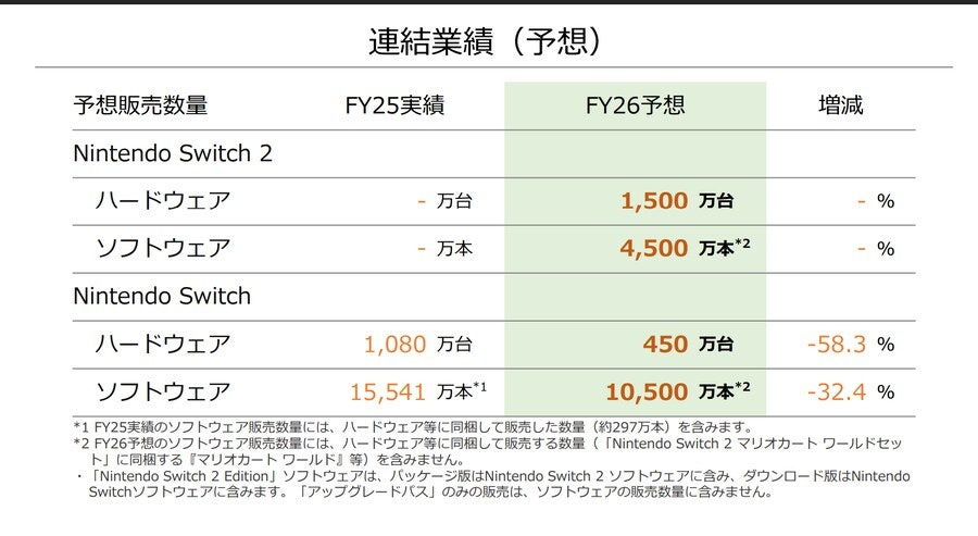 차세대 콘솔을 위해 특별히 개발된 '스위치 2 에디션' 타이틀의 경우, 패키지 버전만 스위치 2 소프트웨어 판매량에 포함됩니다. 다운로드 버전은 기존 스위치 소프트웨어로 집계되며, 업그레이드 패스는 판매량 통계에 반영되지 않습니다.