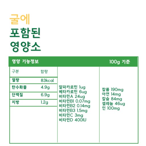 굴에 함유된 아연과 항산화 성분은 피부 재생을 촉진하고, 노화를 늦추는 데 도움을 줍니다. - 뼈 건강 유지