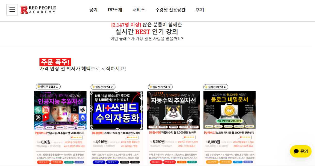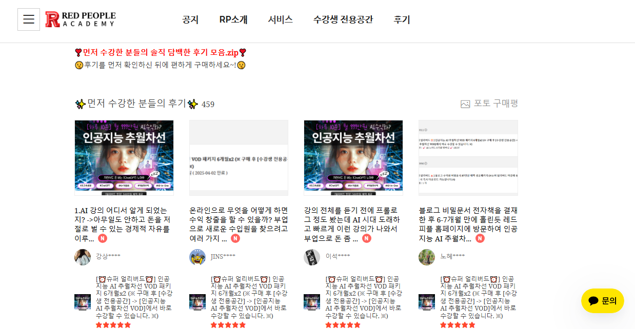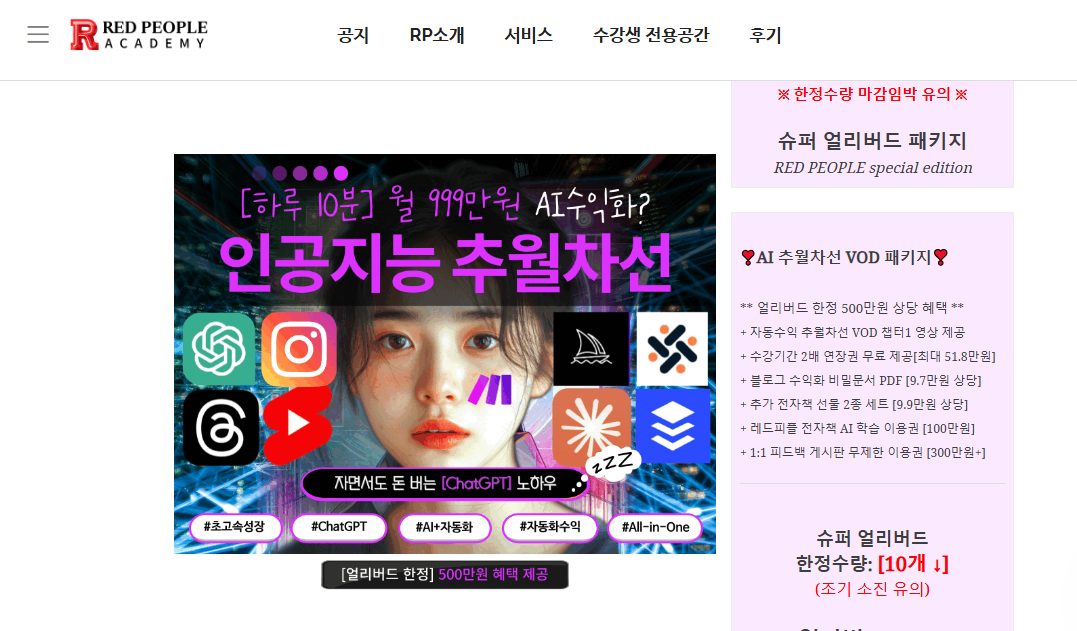 -레드피플 아카데미는 AI강의 뿐 아니라 블로그 강의, 자동수익 강의, 쓰레드 강의 등 정보화 시대에 여러 주제로 수익이 날 수 있게 하는 높은 퀄리티의 강의를 제공하고 있습니다. 그래서 선택하게 되었습니다.