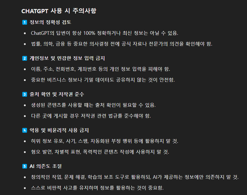 ChatGPT를 사용할 때 주의해야 할 점들입니다.